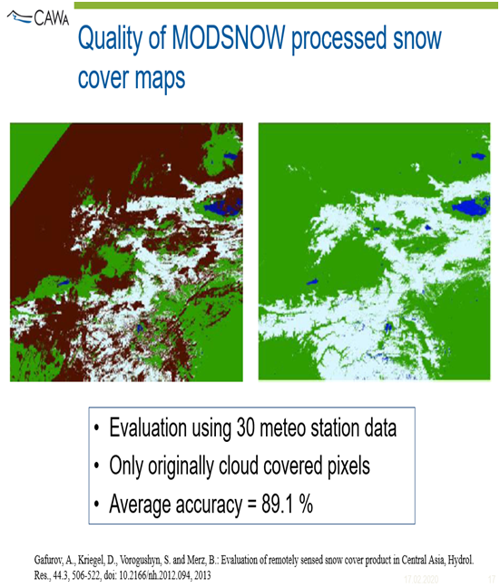 - Yes, to reduce or completely eliminate cloud cover from MODIS snow cover images, various approaches have been developed. To solve this problem, the GFZ Land Research Center (Potsdam, Germany) developed the MODSNOW software package. It has been adapted to the conditions of Central Asia. With the assistance of the Regional Environmental Center for Central Asia (CAREC), a training seminar was organized, as well as a software was installed in Kazhydromet.
