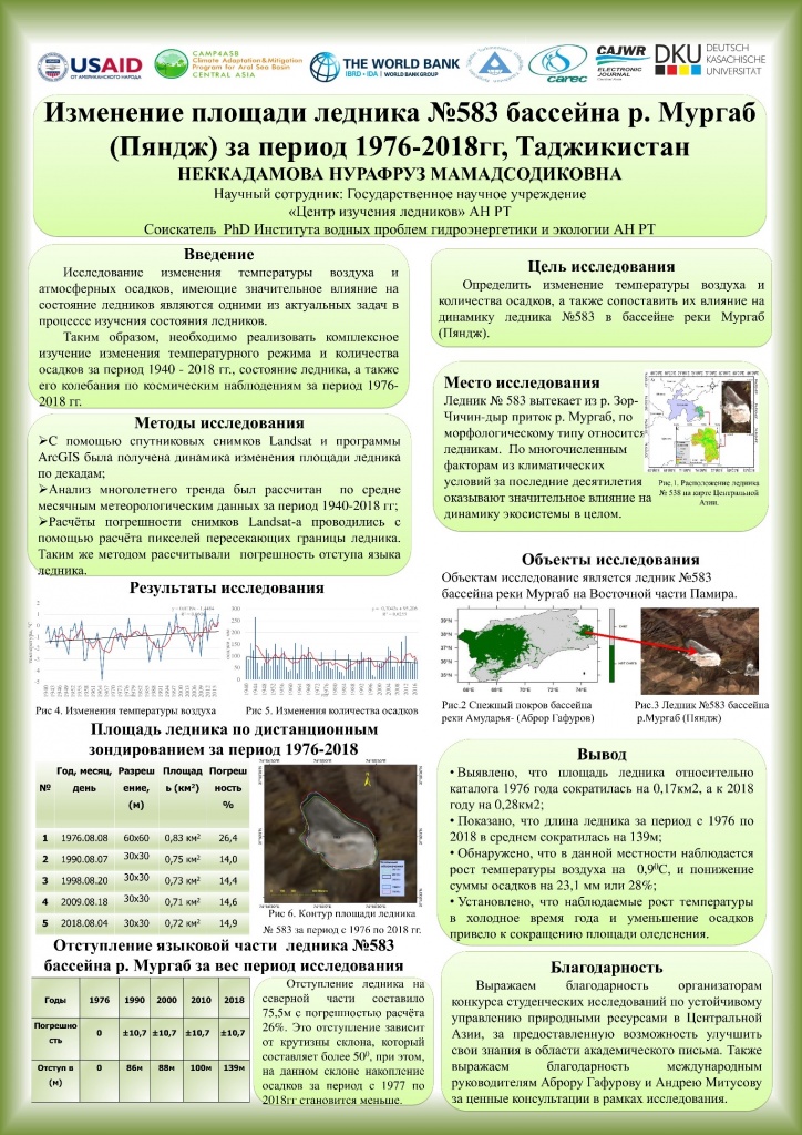 Сегодня мы познакомим вас с исследовательским предложением «Изменение площади ледника №583 бассейна р. Мургаб (Пяндж) за период 1976-2018 гг., Таджикистан», которое предоставила научная сотрудница Государственного научного учреждения «Центр изучения ледников» АН РТ, института водных проблем гидроэнергетики и экологии АН РТ– Неккадамова Нурафруз Мамадсодиковна. Согласно её заключению, изменение климата- один из существенных факторов потери запасов оледенений. Объектом данного исследования был выбран ледник №583, расположенный в низовьях реки Зор-Чичиндыр(приток р. Мургаб), Таджикистан.